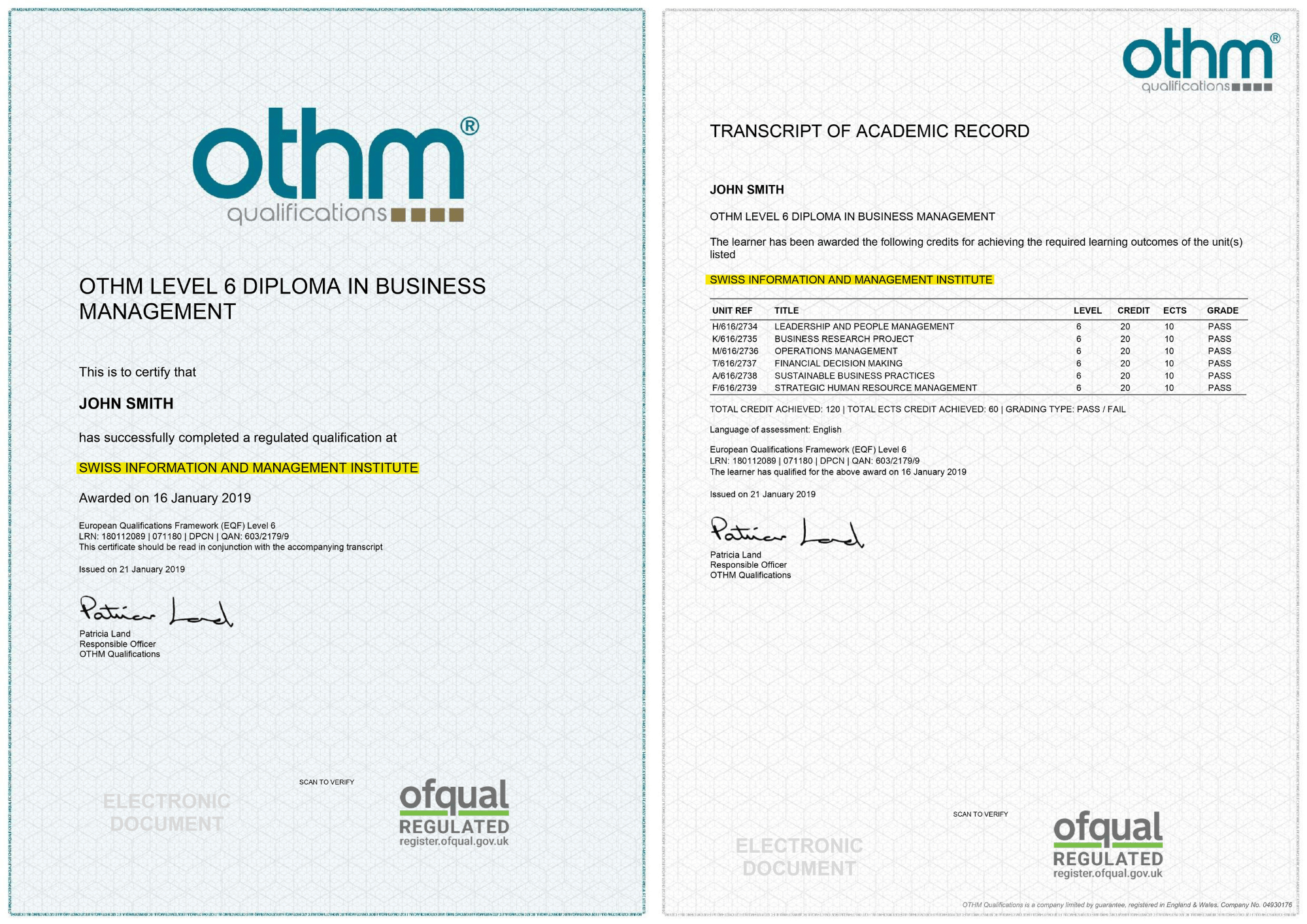• Tham khảo bằng mẫu và bảng điểm OTHM Level 6 Diploma in Business Management TẠI ĐÂY