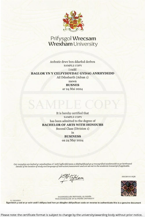 • Bằng mẫu Bachelor of Arts with Honours in Business and Management từ Đại học công lập Anh Quốc Wrexham University TẠI ĐÂY.