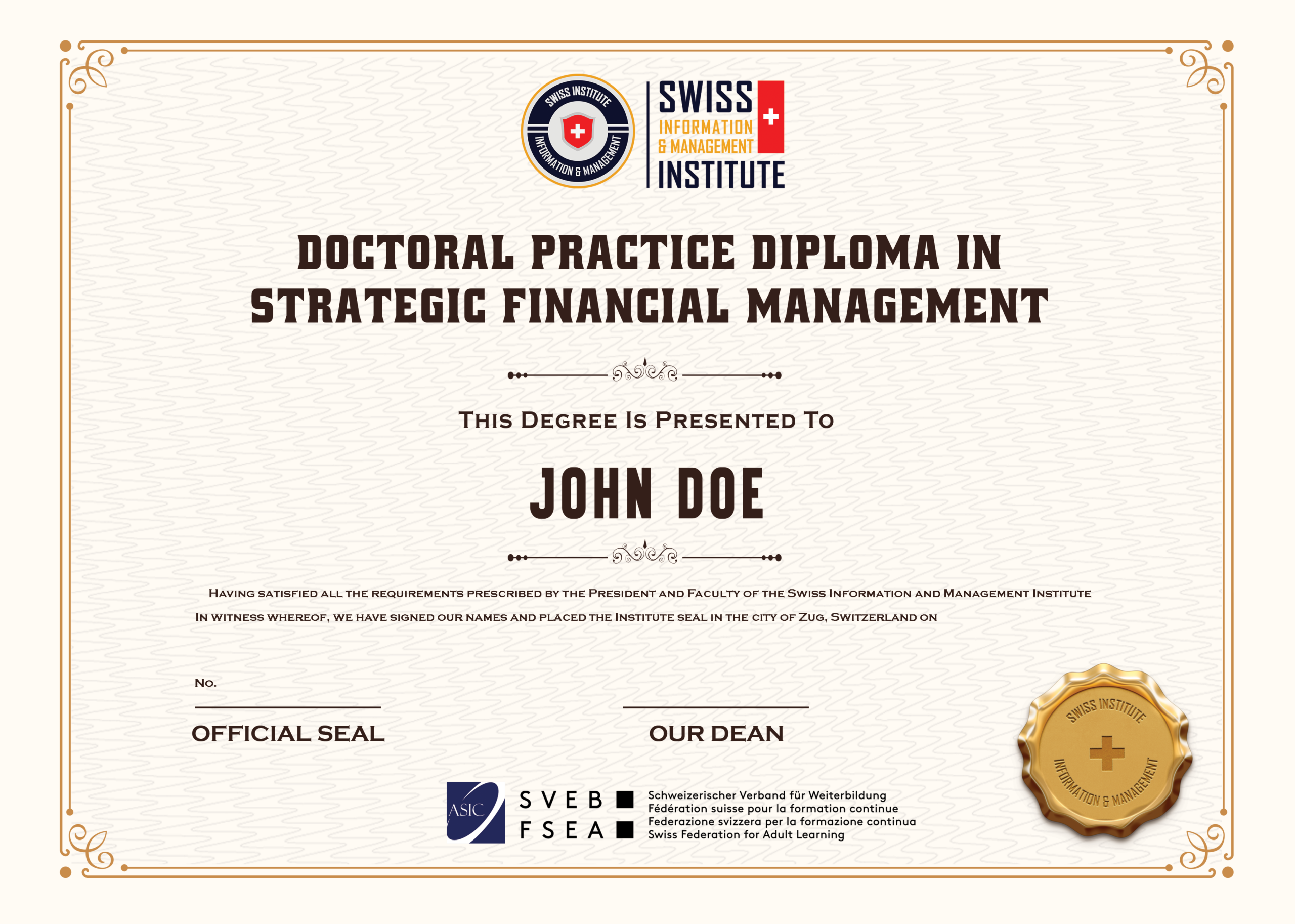 - Doctoral Practice Diploma in Strategic Financial Management cấp bởi SIMI Swiss.