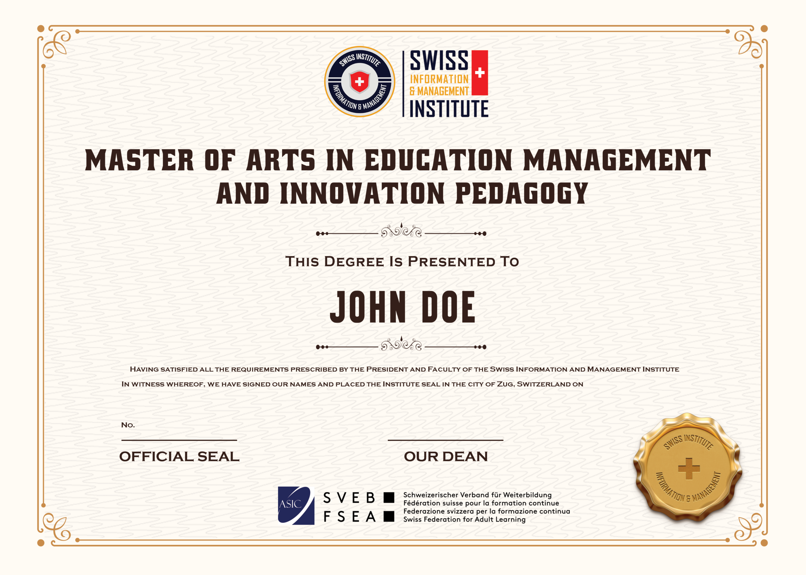 • Master of Arts in Education Management and Innovation Pedagogy cấp bởi SIMI Swiss.