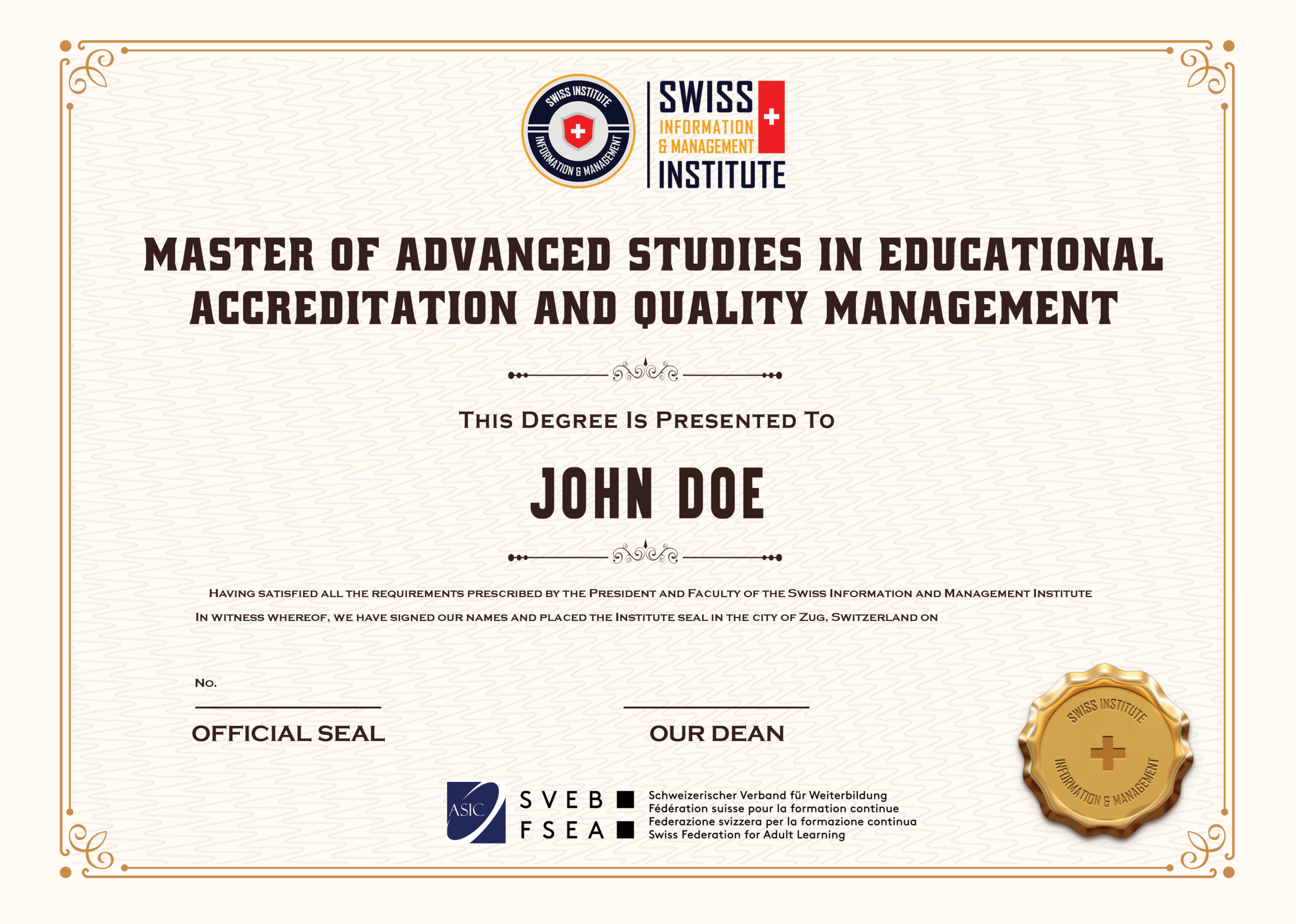 - Master of Advanced Studies in Educational Accreditation and Quality Management cấp bởi SIMI Swiss.