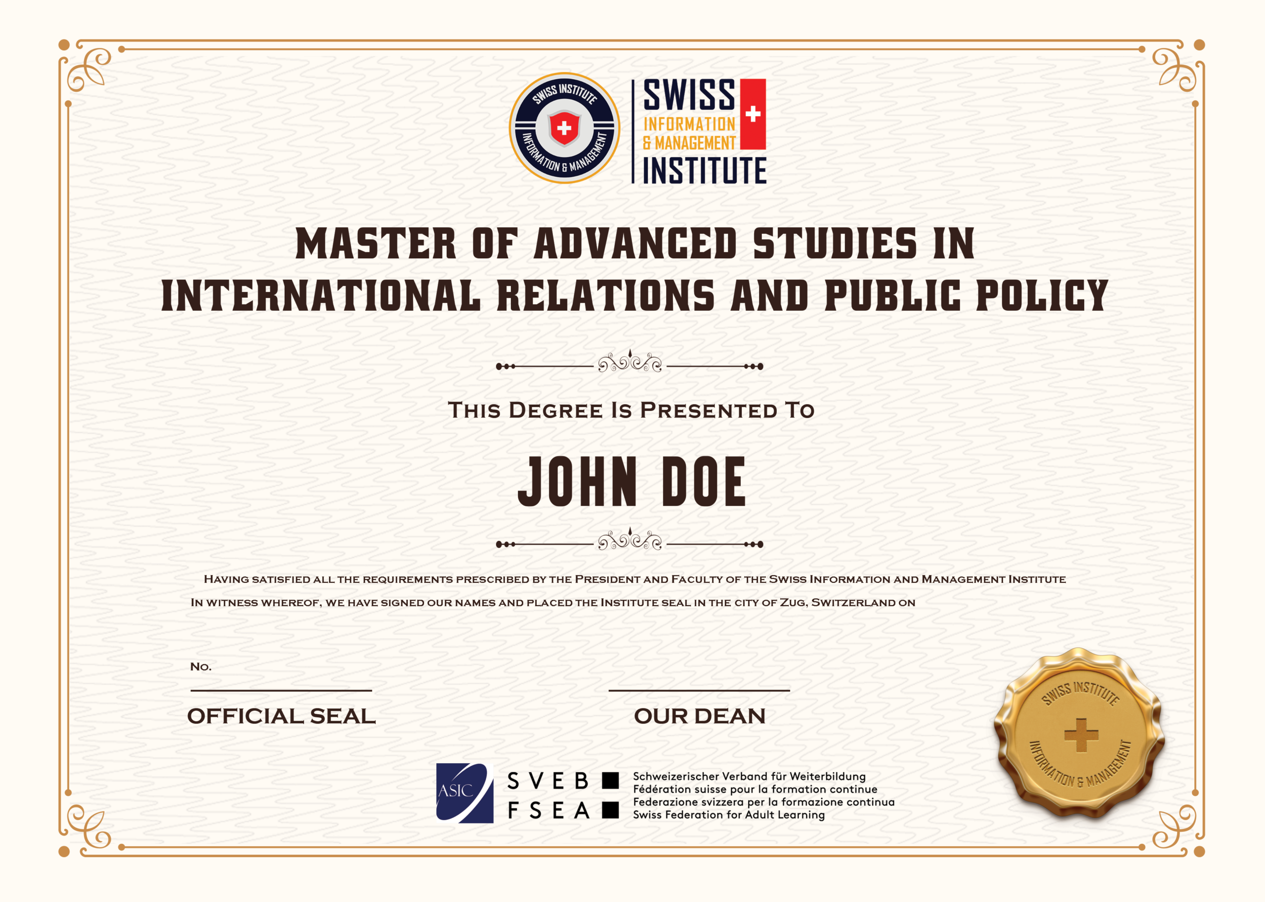 - Master of Advanced Studies in International Relations and Public Policy cấp bởi SIMI Swiss.
