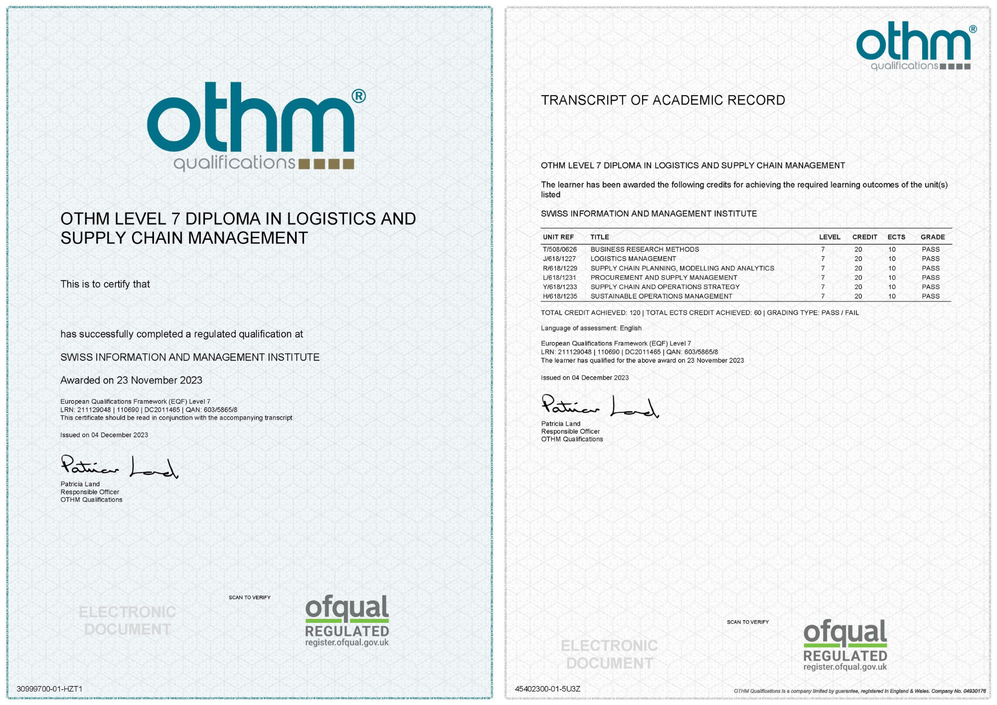 - Level 7 Diploma in Logistics and Supply Chain Management từ OTHM (Công nhận bởi chính phủ Anh Quốc, xếp vào Band 12 UK ENIC/NARIC tương ứng Thạc sĩ).