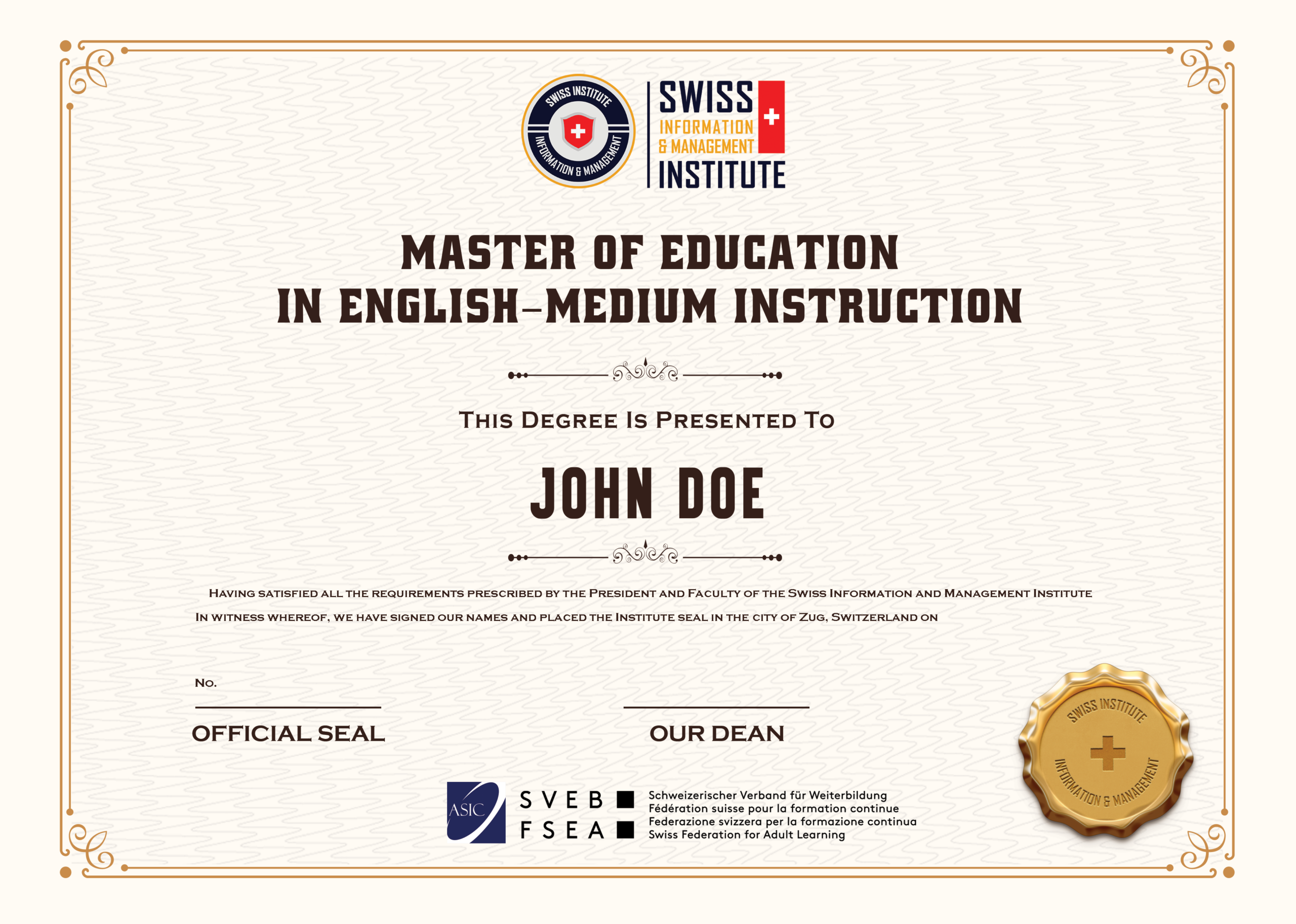 - Master of Education in English–Medium Instruction từ SIMI Swiss