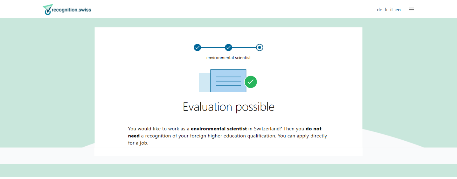 Trong hệ thống việc làm tại Thụy Sĩ, Environmental Scientist tại các cơ sở đào tạo tư thục thuộc nhóm nghề nghiệp có thể được tuyển dụng dựa trên bằng cấp tư thục được quốc tế công nhận.