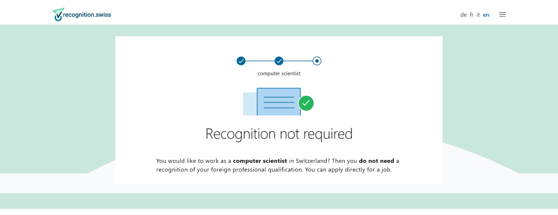 Văn bằng SwissUK do SIMI cấp được công nhận khi làm việc tại Thụy Sĩ mà không cần thêm bất kỳ thủ tục bổ sung nào, vì vị trí Computer Scientist thuộc nhóm nghề nghiệp không yêu cầu giấy phép hành nghề.