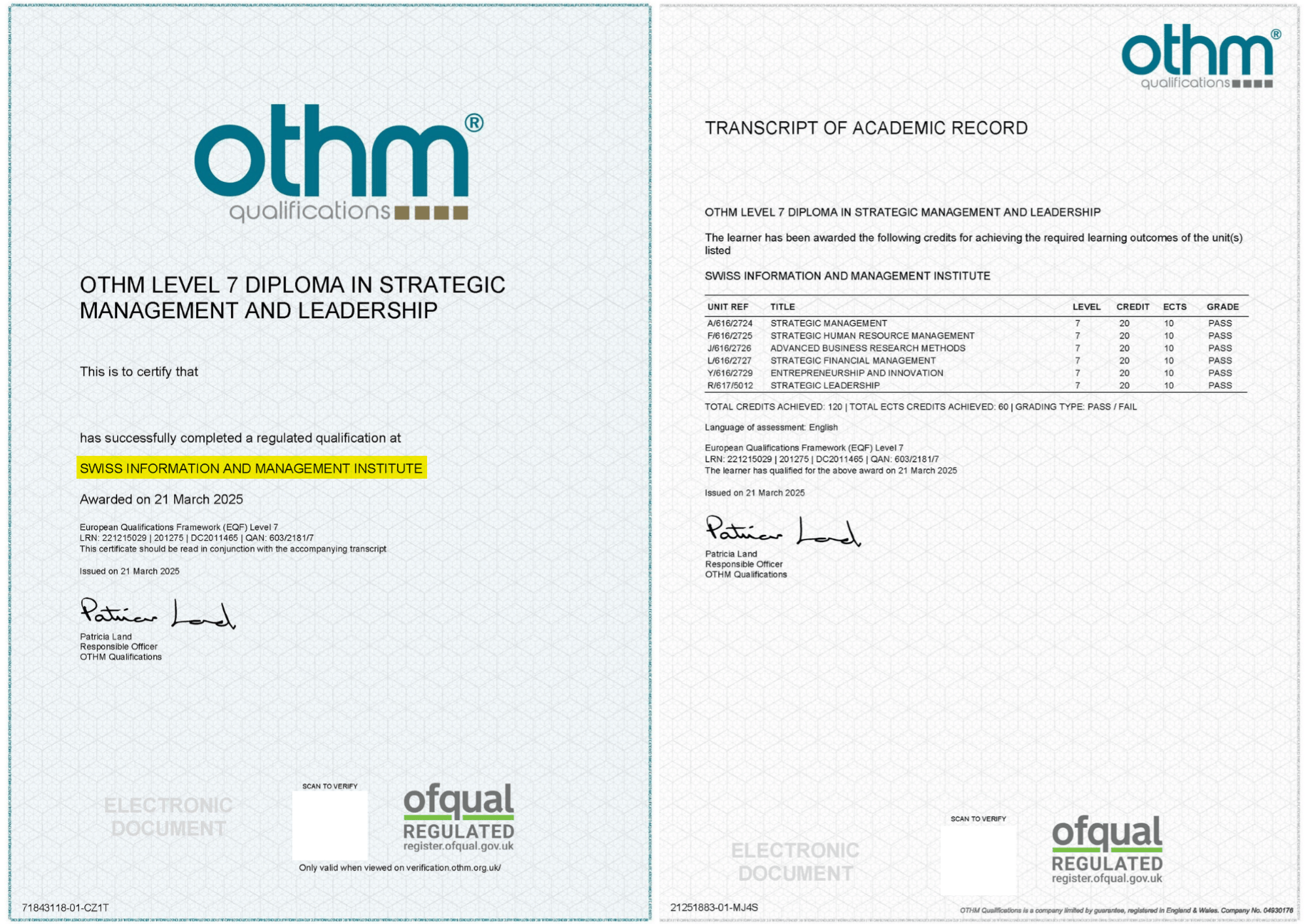 - OTHM Level 7 Diploma in Strategic Management and Leadership (công nhận bởi Ofqual – Chính phủ Anh)